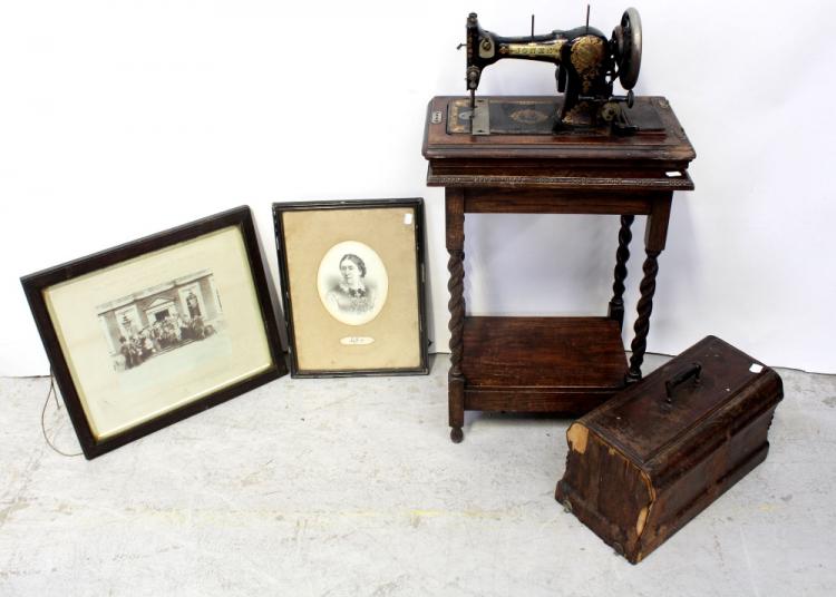 Lot 228 of 922: An early/mid-20th century mahogany rectangular hall table of small proportions with lower shelf to wrythen support and ball feet, an early 20th century cased Jones sewing machine (used by seamstress to Lady Derby) and two photographs from Croxteth Hall, one of Lady Derby c1890 and a photograph of Lord Derby, Earl Roberts and Viscount Kitchener at Knowsley Hall, October 11th 1902 with various other illustrious persons (4).