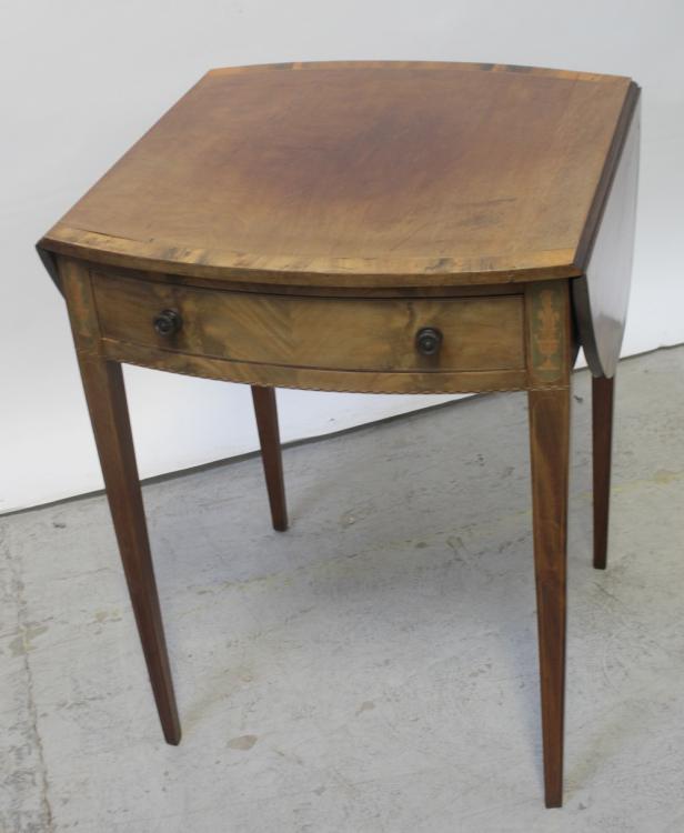 Lot 22 of 590: An Edward VII mahogany and walnut cross-banded Pembroke table, the oval top with single frieze drawer supported on square tapering line inlaid legs, height 75cm.
