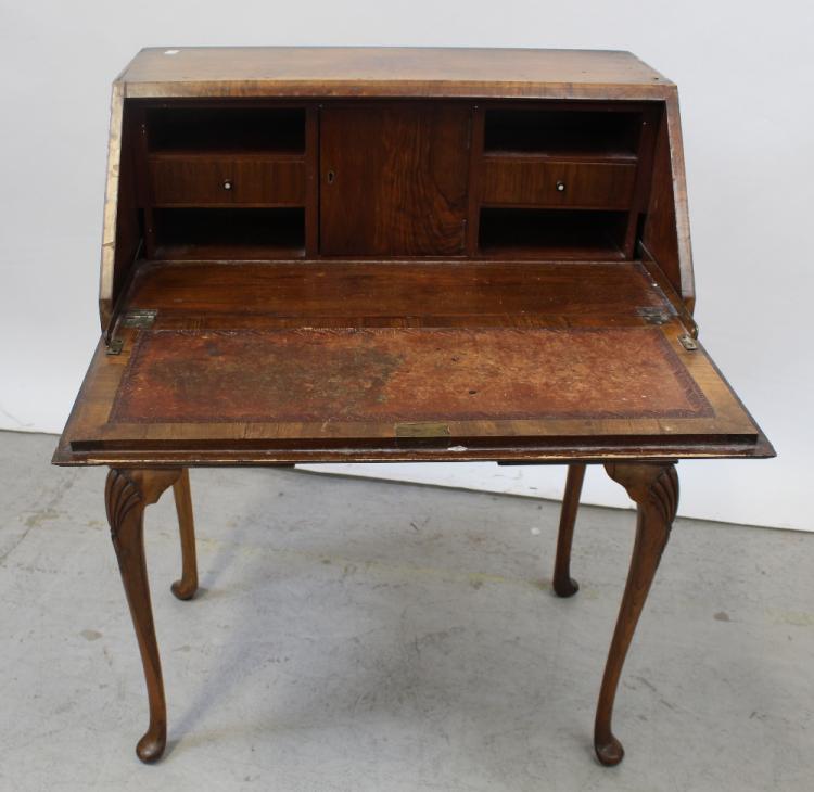 Lot 34 of 590: A 1930s walnut bureau with cross banded fall and lowboy-style base, on shell carved cabriole legs to pad feet, height 98cm.