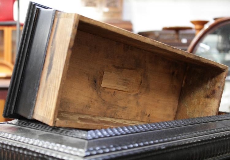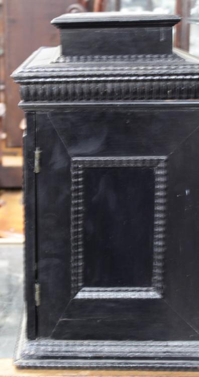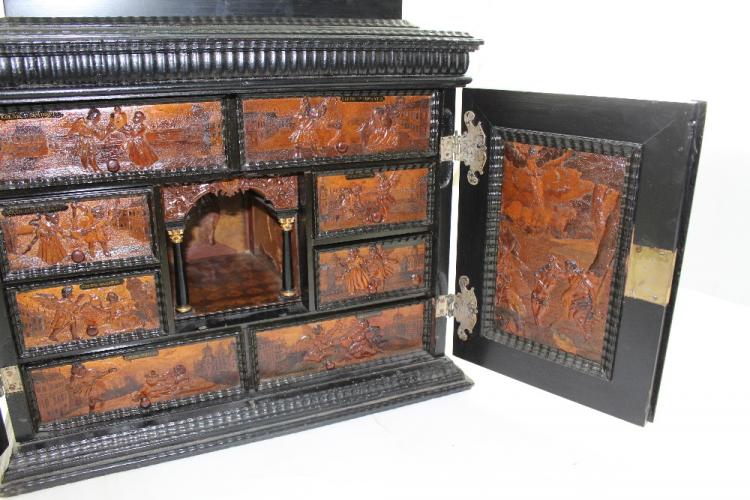 Lot 2 of 1176: A 17th century Neapolitan or North European ebonised and marquetry table cabinet, the shallow relief and marquetry door panels to the front with Madonna and Child and to the inside the canonisation of Saint Sebastian and Jesus, Mary and John the Baptist, the drawer fronts decorated with Stations of the Heart including Cordeis Illvminatio, Cordeis Donatio and Cordeis Flores amongst others, lacking the door to the internal well and to each of the four bun feet, height 47cm.