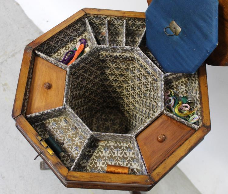 Lot 35 of 1176: A 19th century walnut inlaid sewing table with interior fabric covered sections to octagonal column support to tripartite base, height 77cm.