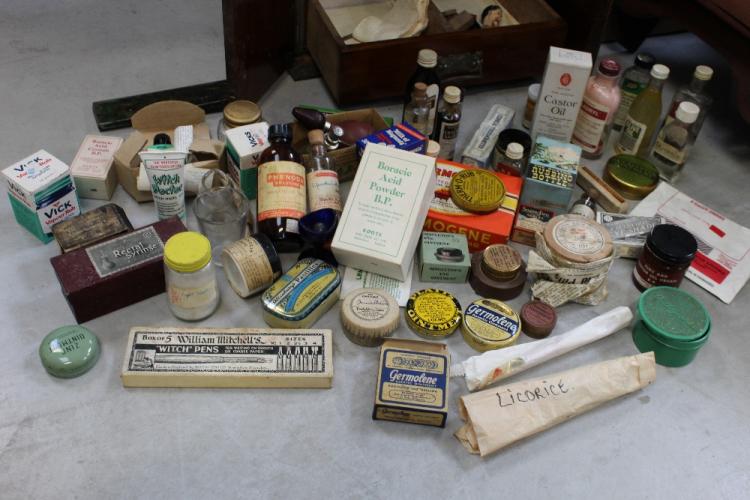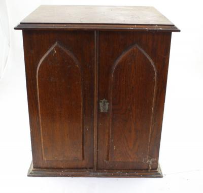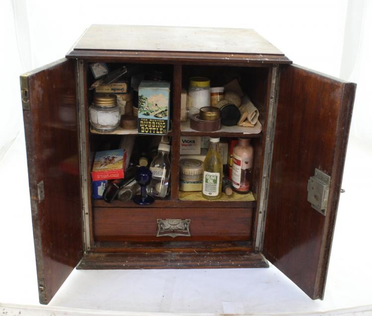 Lot 54 of 1176: A late Victorian double-fronted tabletop cabinet opening to reveal vintage medical supplies, height 42.5cm.