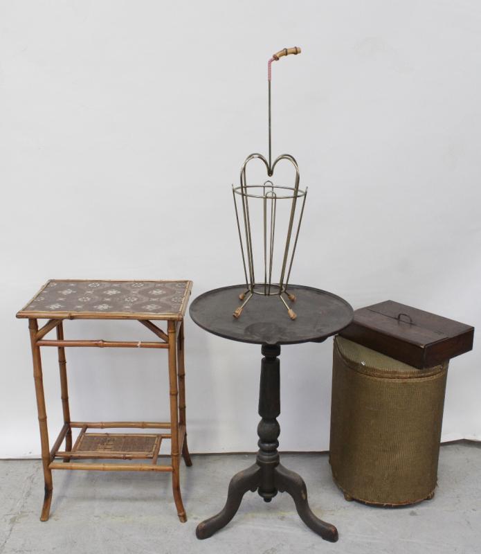 Lot 63 of 1176: An Edwardian bamboo side table, a Lloyd Loom style linen basket, an oak cutlery box and a vintage metal umbrella stand in the form of an umbrella.