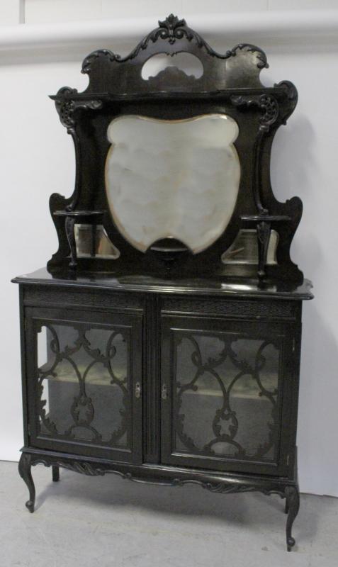 Lot 64 of 1176: An Edwardian ebonised Empire cabinet, shaped mirror and shelves above two door glazed base, on cabriole legs, height approx 215cm.