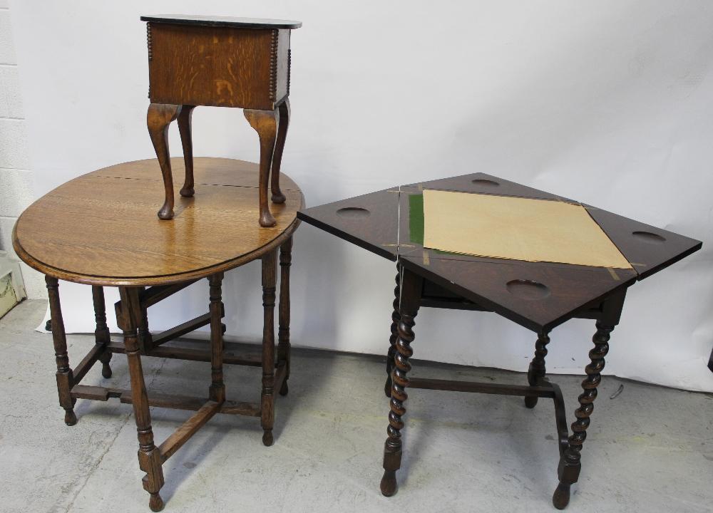 Lot 65 of 1176: An Edwardian four-sectional envelope card table on wrythen supports, an early/mid-20th century gateleg table, to turned supports and a mid-20th century sewing box (3).