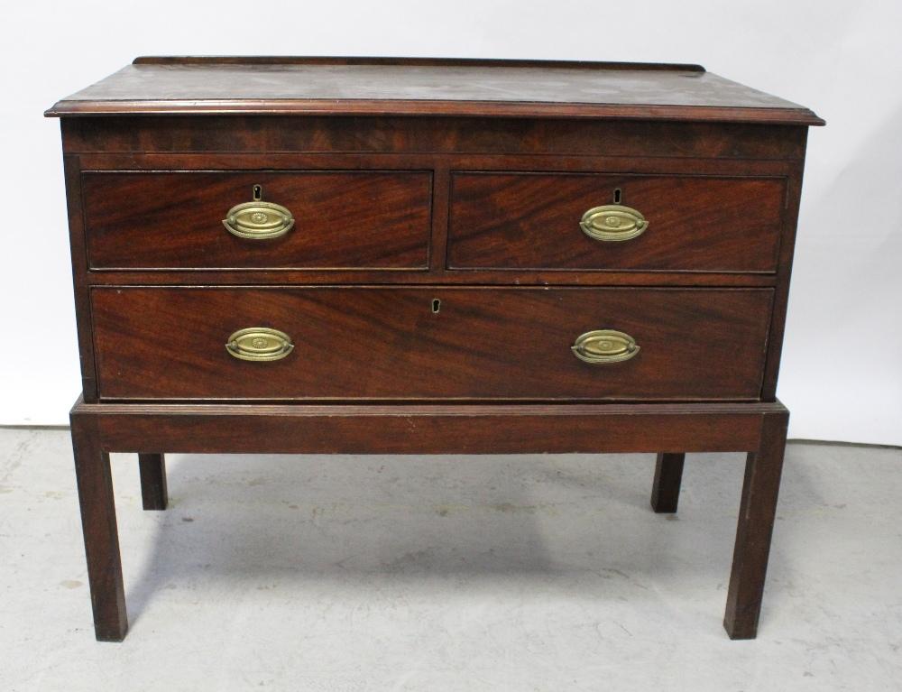 Lot 70 of 1176: An Edwardian mahogany two-over-one long drawer chest, on block supports, 81 x 103cm and an Edwardian wall mirror with two small mirrors, carved centre, originally from a sideboard (2).