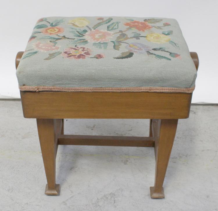Lot 72 of 1176: An Edwardian piano stool, tapering supports and cross-stretcher with floral tapestry seat.