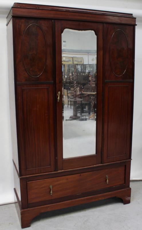 Lot 73 of 1176: An Edwardian single mirror door wardrobe with panelled sides to one long drawer, to shaped plinth base, one hanging rail to interior, 198 x 119cm.