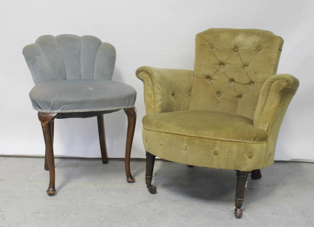 Lot 75 of 1176: An early 20th century button-back armchair, tapering arms to curved front to turned supports and castors and an Edwardian Art Deco style chair with shell back to tapering cabriole supports and pad feet (2).