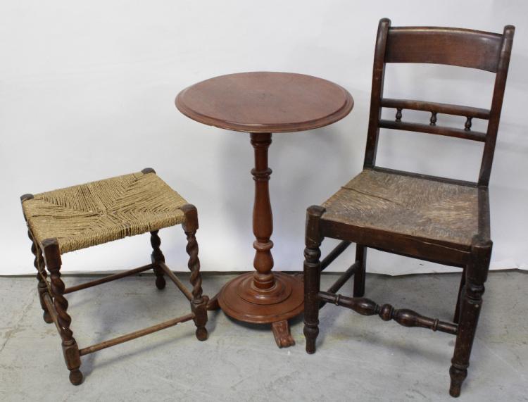 Lot 77 of 1176: An early 20th century kitchen chair with rush seat, a stool with rush seat and a mid-20th century circular side table (3).
