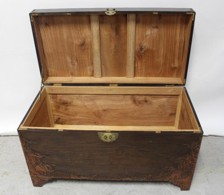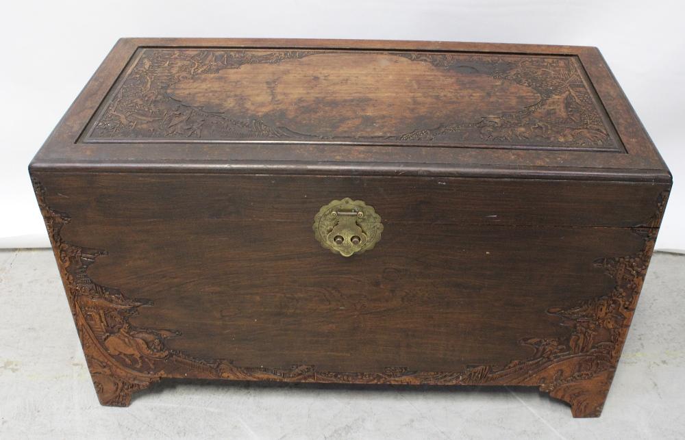 Lot 82 of 1176: An early 20th century Oriental camphorwood chest with figural and scenic decoration, 59 x 104cm.