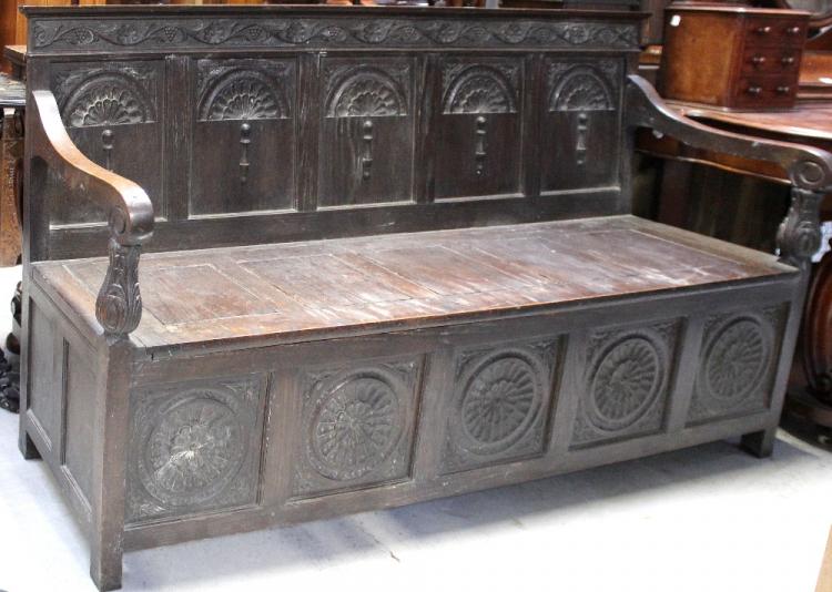 Lot 85 of 1176: A good Edwardian oak bench settle with scrolling leaf and vine decoration to the frieze over a five-panel back, with seat compartment decorated with four carved floral panels, width 172cm.