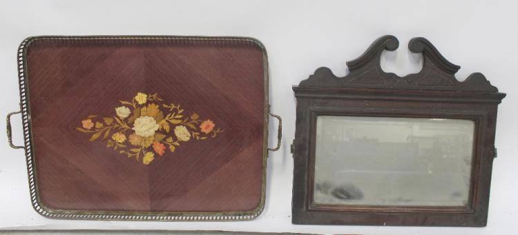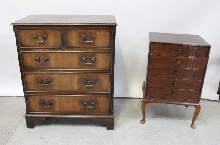 Lot 86 of 1176: A 20th century mahogany two-over-three chest of drawers, length 90cm, a mahogany five-drawer music cabinet, a mirror originally from a dressing table, an Italian inlaid gallery tray and a reproduction chest of drawers (5).