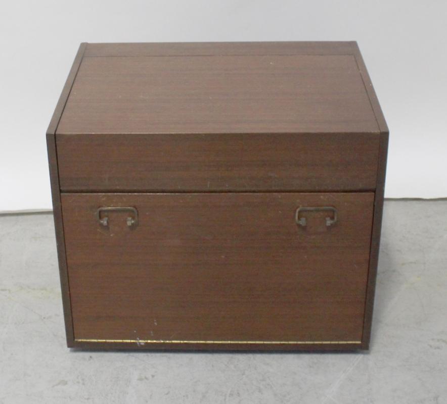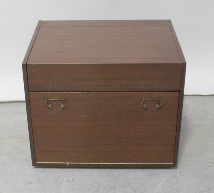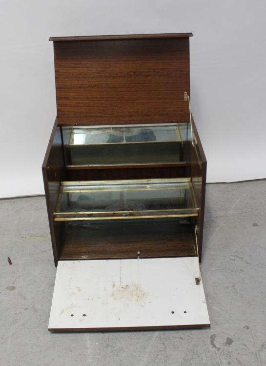 Lot 91 of 1176: A mid/late 20th century sapele mahogany folding drinks cabinet opening to reveal a mirrored shelf and back, width 61cm.