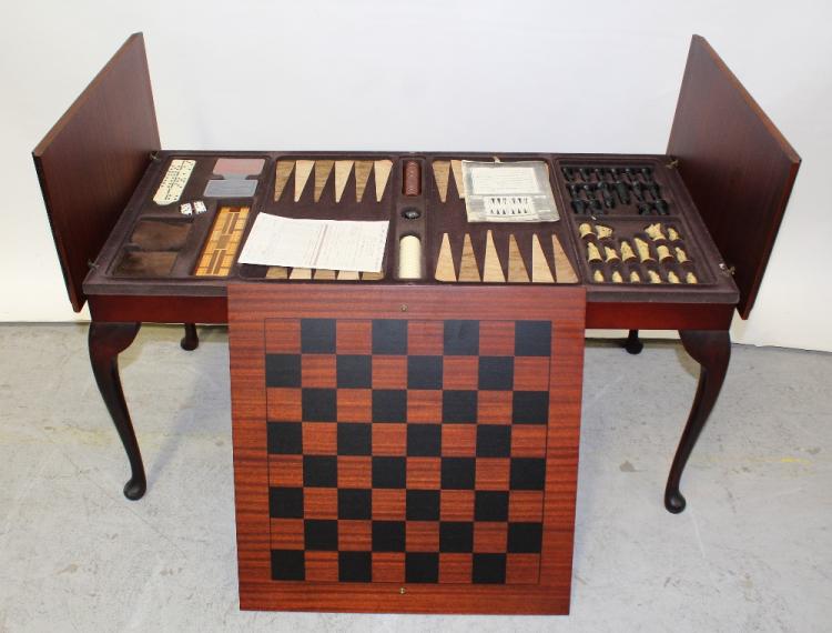Lot 92 of 1176: A contemporary mahogany coffee table with central leaf which flips up to reveal a games compendium with chessboard, draughts pieces, cribbage board, playing cards etc.