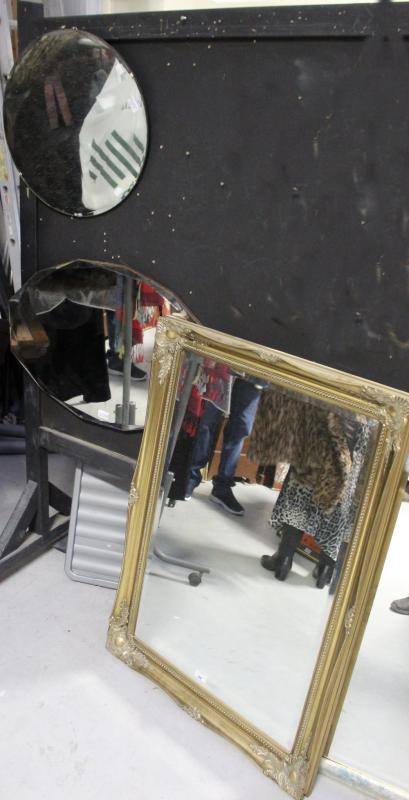 Lot 94 of 1176: A modern bevel-edges gilt-framed wall mirror, height 106cm and two unframed examples, one of circular form, the other a truncated ellipse (3).