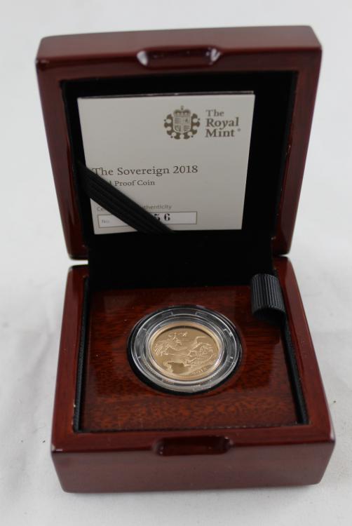 Lot 1032 of 1176: An Elizabeth II 2018 gold sovereign coin in wooden presentation case and original protective boxes.