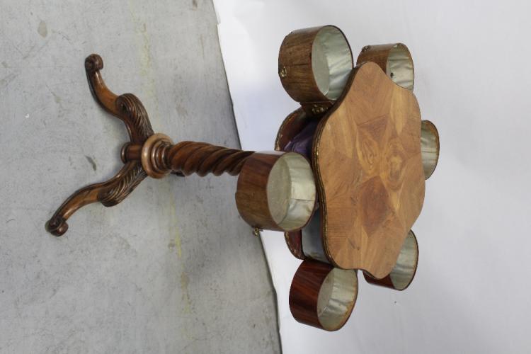 Lot 50 of 948: A late 19th century inlaid walnut octagonal jewellery table with six circular silk-lined drawers, on wrythen column and tripartite base.