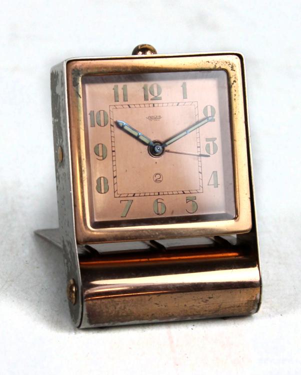 Lot 1037 of 1276: JAEGER; an early to mid-20th century Swiss travel alarm clock in hinged metal case, the square dial set with Arabic numerals, dial 4.5 x 4.5cm.