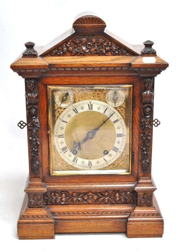 Lot 1048 of 1276: WINTERHALDER & HOFMEIER; an oak cased mantel clock with carved foliate decoration, the silver chapter ring set with Roman numerals and outer Arabic numerals, diameter 15cm, with slow/fast and chime/silent dials, height total approx 46cm.