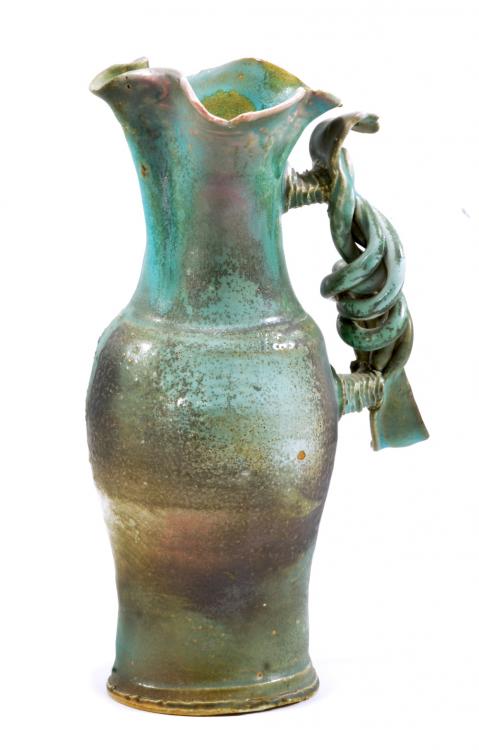 Lot 45 of 476: COLIN PEARSON (1923-2007); a stoneware jug with twisted handle covered in semi matt turquoise glaze, impressed mark, height 28cm (D).