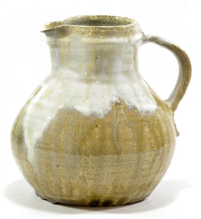 Lot 51 of 476: WILLIAM MARSHALL (1923-2007); a squat stoneware jug covered in green ash glaze with Chun pours, impressed WM mark, height 18.5cm (D).