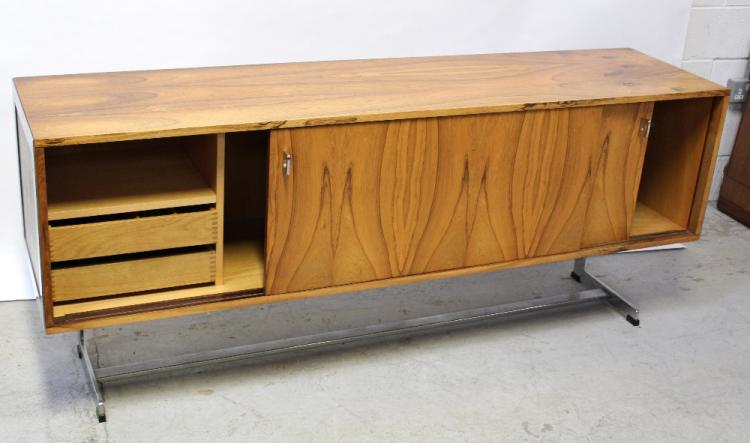 Lot 1 of 788: Merrow Associates; a mid-20th century rosewood and chrome sideboard, possibly by Richard Young, two sliding doors, chrome frame and handles to chrome supports, 65 x 183cm. CITES certificate no.577466/01