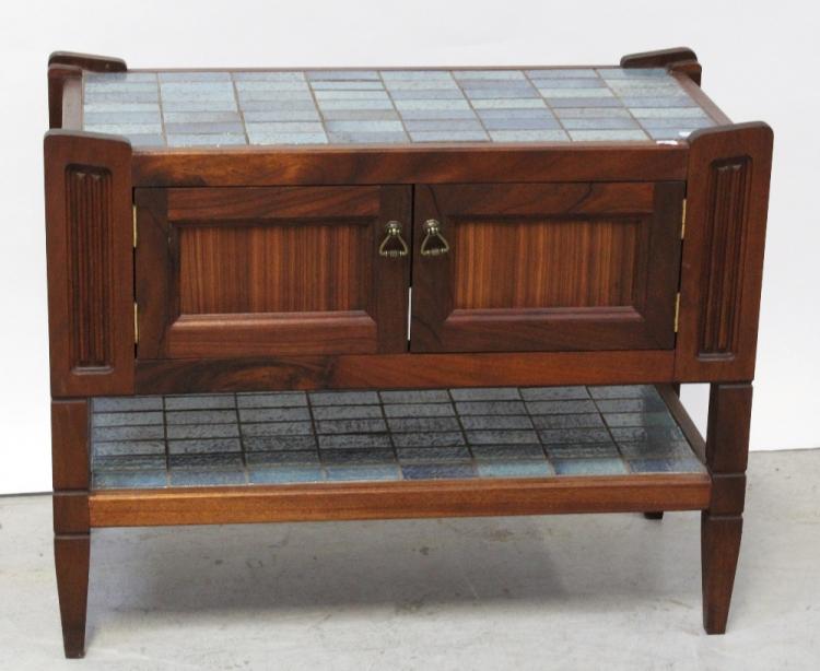 Lot 18 of 788: A 1970s teak tile-top hall cabinet on square tapering legs united by a tiled shelf stretcher, width 89cm.