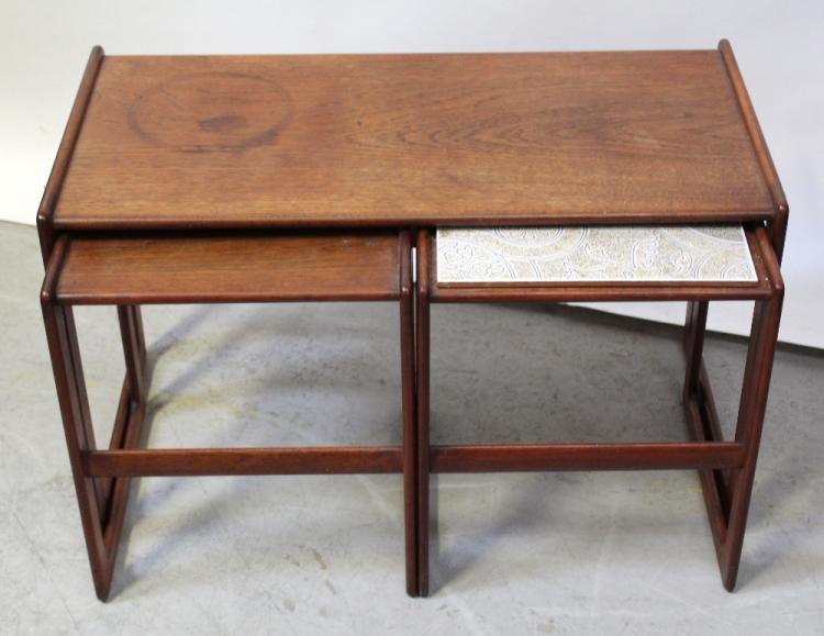 Lot 23 of 788: A c1960s Danish nest of three teak tables (one with later added tiled top), width of largest 80.5cm.