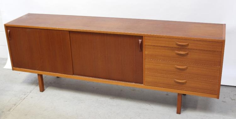 Lot 29 of 788: A late 1960s/early 1970s Scandinavian-style teak sideboard of two sliding door cupboard with a bank of four drawers on the right hand side, supported on square chamfered legs, length 200cm.