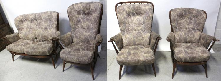 Lot 31 of 788: An Ercol cottage suite comprising a sofa, width 139cm and three chairs in stained beech with spindle supports (4).