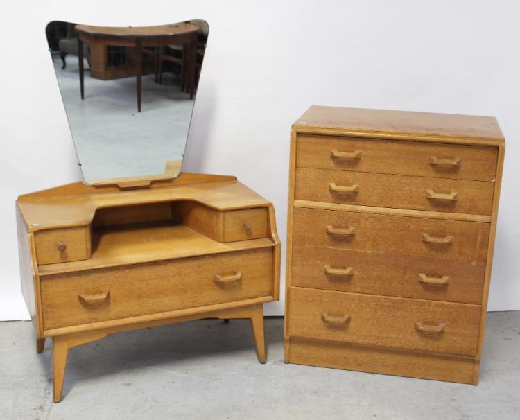 Lot 36 of 788: A 1970s oak part bedroom suite comprising an oak dressing table with shield-shaped swing mirror and a matching chest of five drawers, height 97.5cm (2).
