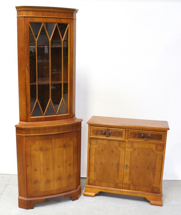 Lot 43 of 788: A late 20th century narrow yew wood hall cabinet of two drawers over two doors, supported on ogee bracket feet and a matching modern yew wood corner unit with glazed elevated section and single cupboard base, height 179cm (2).