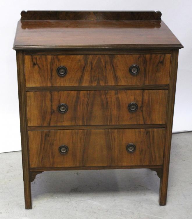 Lot 54 of 788: A 1930s walnut chest of three drawers on serpentine fluted square legs, height 91.5cm.