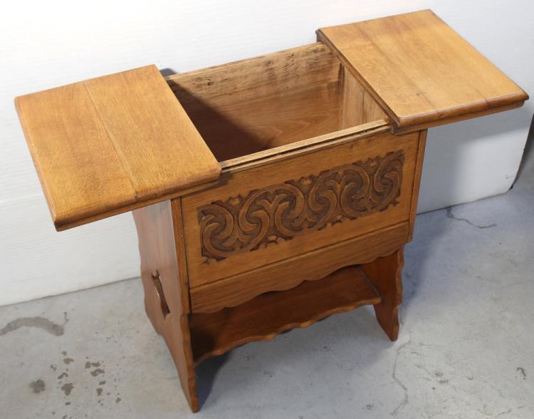 Lot 59 of 788: A modern oak slab-end workbox with incised carved panels, slide open top with fitted interior, height 57.5cm.