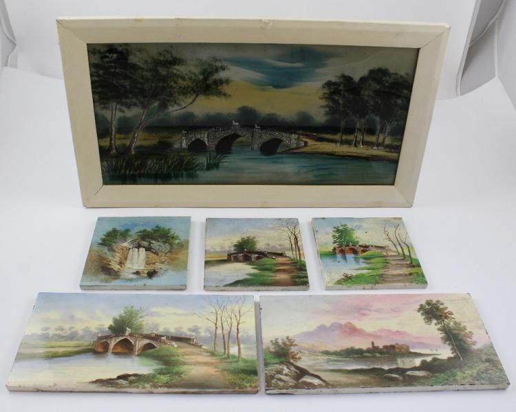 Lot 259 of 788: A late 19th century reverse painting on glass and mother of pearl landscape of the Lion Bridge in Leigh, 25.5 x 51cm, in painted frame and a group of polychrome transfer-printed tiles, one of which depicting the same bridge, the others coastal castles and waterfalls, including Riversmade Falls, Loch Lomond (6).