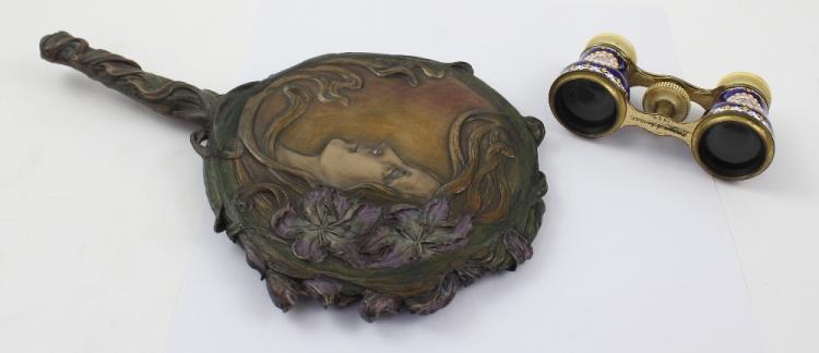 Lot 264 of 788: An Art Nouveau bronzed and hand-tinted hand mirror with an image of young lady with flowing hair and water iris, handle is a scantily-clad young maiden and a 19th century pair of ivory and blue enamelled floral decorated opera glasses, engraved 'L.E.L.B. 1864' (2).