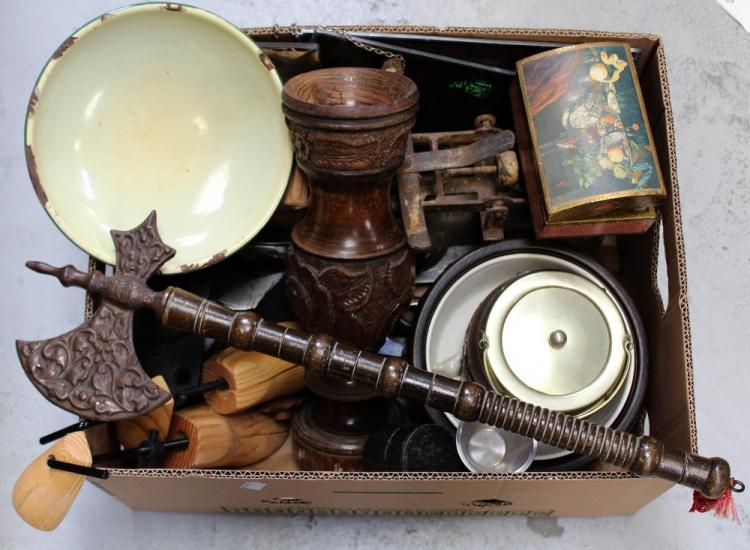 Lot 266 of 788: A collectors' lot to include a treen fruit bowl, biscuit bowl with white metal rim and cover, a pair of vintage wooden shoe trees, a pair of vintage scales, a quantity of metal stair rods, flatware, a box containing small ceramic pagodas etc.