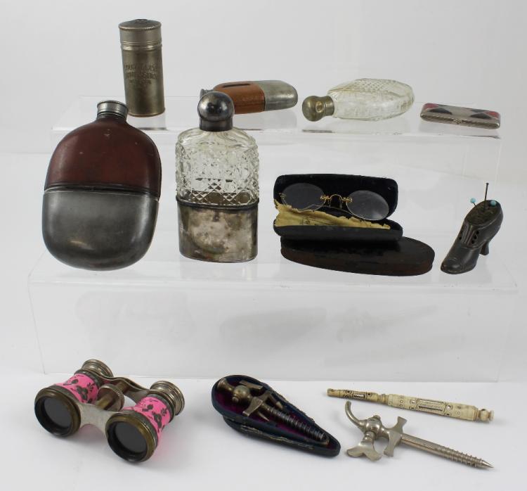 Lot 278 of 788: A mixed lot to include a cased tap and spigot with two replacement spikes, a further uncased spigot, a large and a small half-leathered hip flask, a cut glass and white metal hip flask, a tin-cased set of scales, opera glasses, manicure set etc.