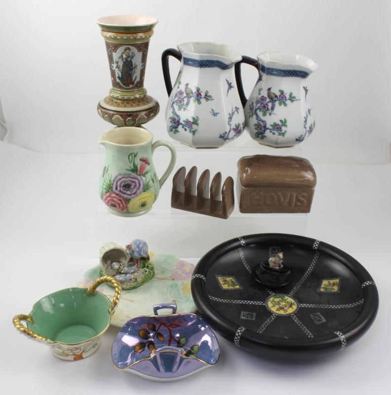 Lot 374 of 788: A mixed lot of ceramics to include a Mettlach polychrome vase, a Carltonware loaf box and loaf-shaped toast rack, two Losol ware jugs, a Radfords 1930s jug and plate, a porcelain animal group of turkeys etc.