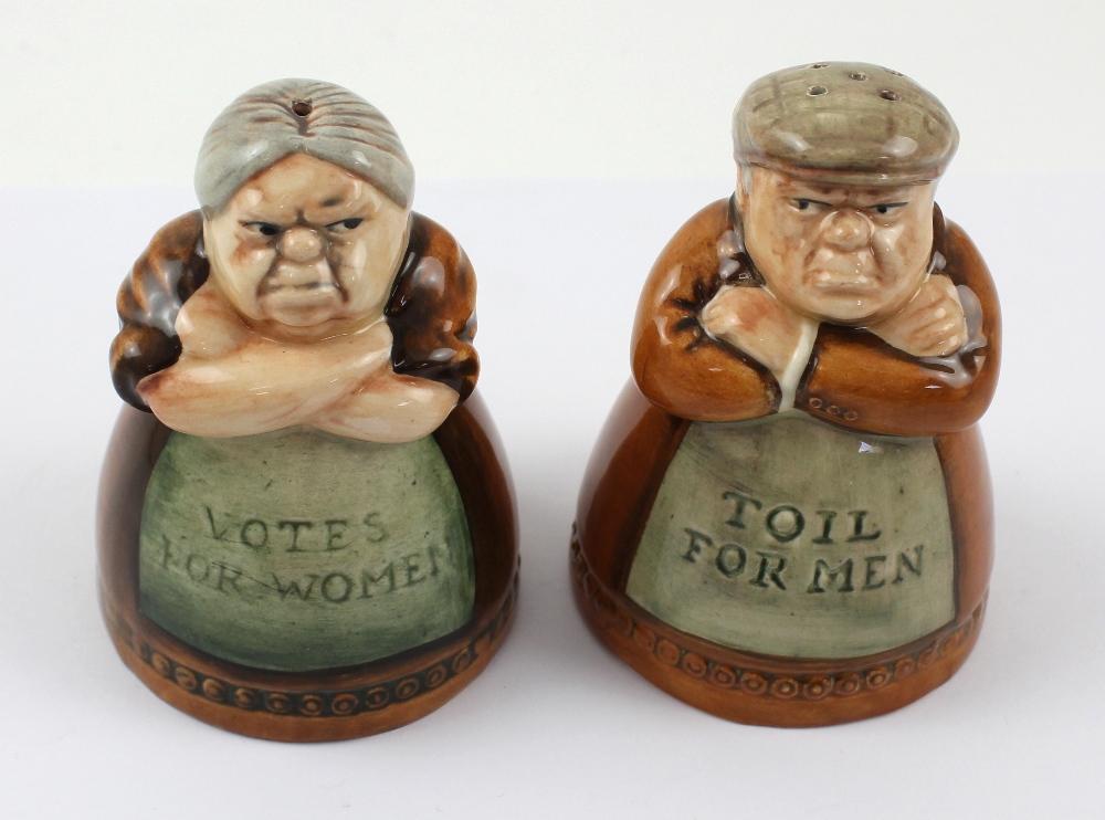 Lot 376 of 788: A Royal Doulton 'Women For Votes and Partner' salt and pepper cruet set (2).