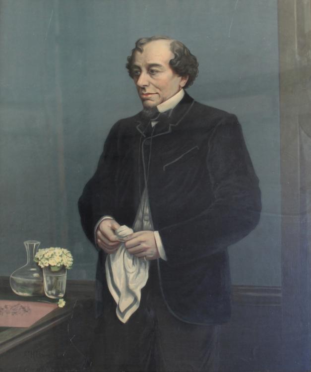 Lot 487 of 788: After George Hamilton Barrable; giclée print, portrait of Benjamin Disraeli with handkerchief, 85 x 65cm, framed and glazed.