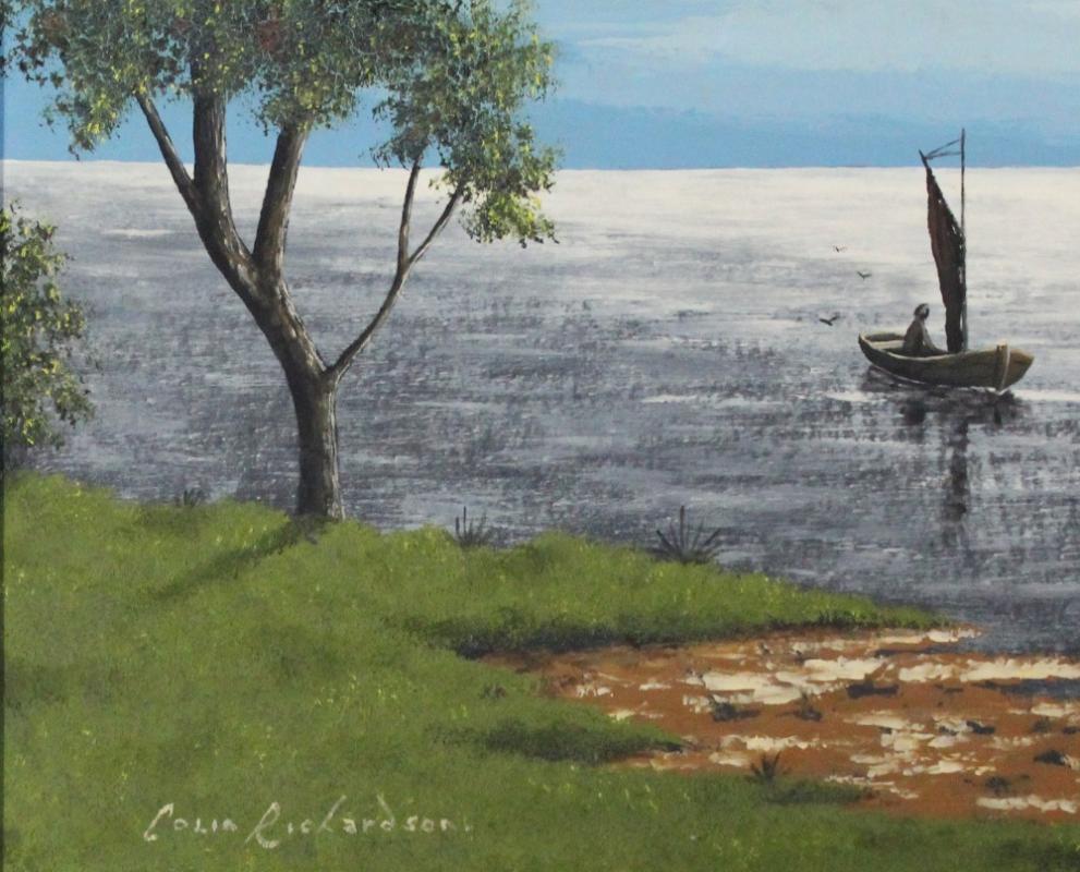 Lot 498 of 788: COLIN RICHARDSON (20th century); oil on board, coastal landscape with cottages and boats, signed lower-left, 30.5 x 102.5cm, in brown velour and gilt frame.
