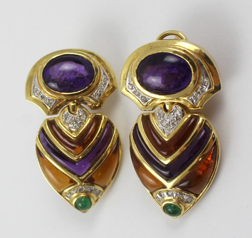 Lot 726 of 788: A pair of yellow metal precious stone set earrings, testing as 18ct, set with cabochon amethyst flanked by chip diamonds with lower articulated pendant section set with citrine, amethyst and chip diamonds, length of each 4cm, approx 32.5g.