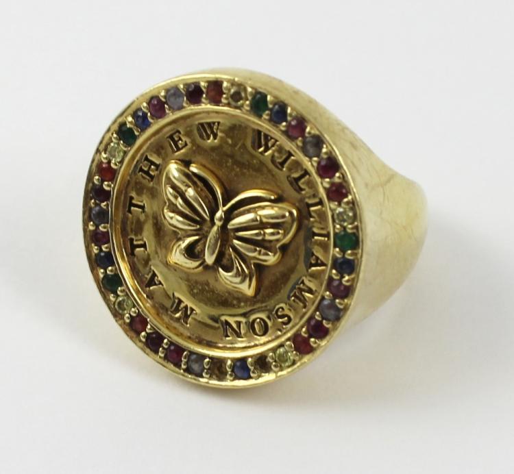 Lot 730 of 788: A yellow metal Matthew Williamson butterfly ring with central butterfly motif encircled by the name 'Matthew Williamson' within multi precious stone border, believed to be rubies, emeralds, sapphire, chip diamond and citrine, size M, approx 13g.