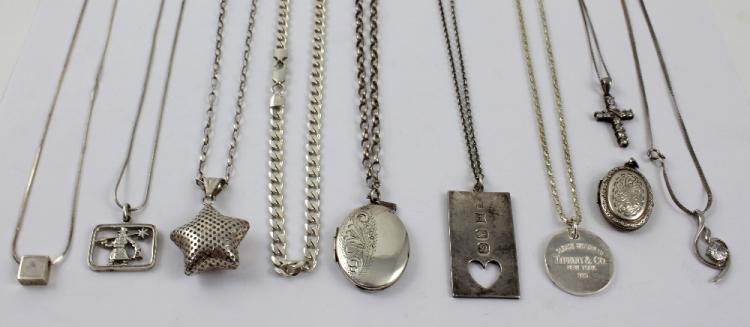 Lot 737 of 788: A collection of silver necklaces and pendants to include silver lockets, curb chain, a silver rope chain with Tiffany & Co New York pendant, an open link chain with reticulated star pendant etc, approx combined 3ozt.