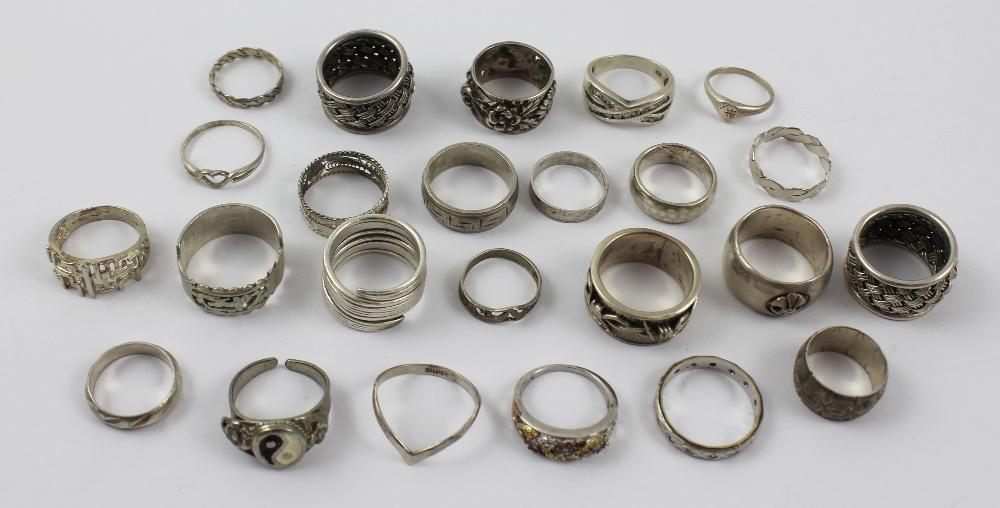 Lot 741 of 788: A collection of silver dress rings to include a barbed wire ring, two basketweave bands, knotwork band, hand-hammered band etc, approx 3.5ozt.