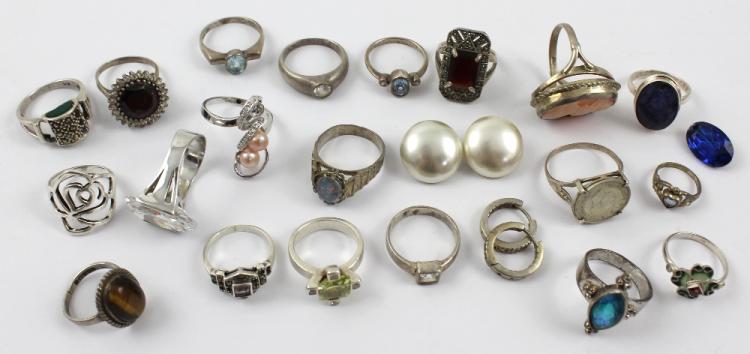 Lot 742 of 788: A collection of mainly silver dress ring inset with stones, mother of pearl, faux pearls etc, to include a shell cameo example, a tiger's-eye example etc, approx 3ozt.