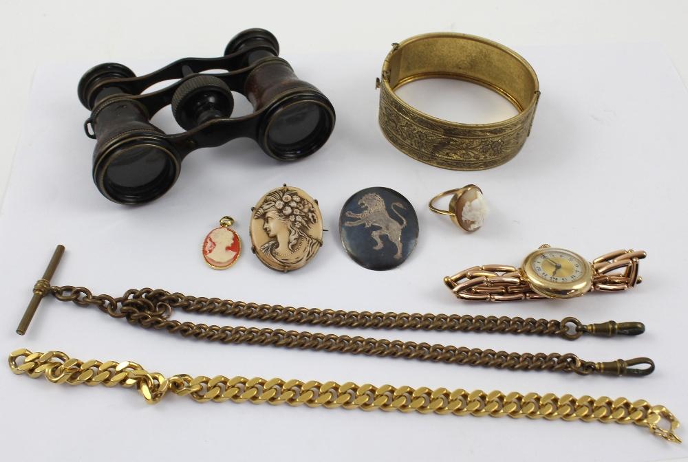 Lot 743 of 788: A mixed lot of jewellery and costume jewellery to include a 9ct gold shell cameo ring, size M, a gold-plated curb chain, a base metal double watch Albert, gold-plated bangle and a gold 1930s trench watch with gold-plated strap.