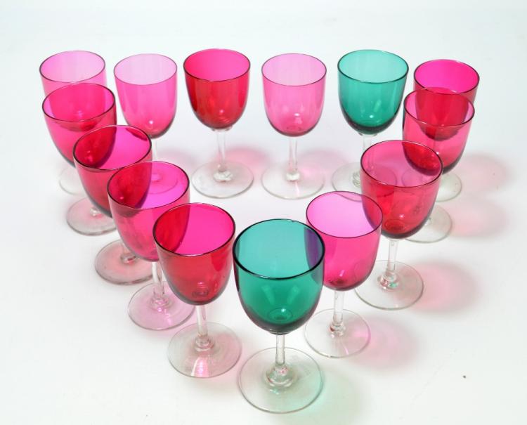 Lot 920 of 2482: A harlequin set of twelve cranberry tinted and clear glass wine glasses and pair of similar green glass examples (14).